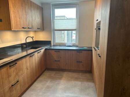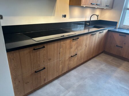 Keuken, uitgevoerd met composiet blad en eiken fineer fronten, behandeld met Rubio Monocoat