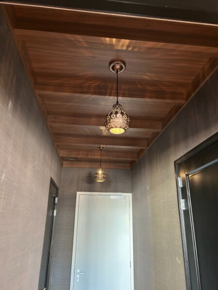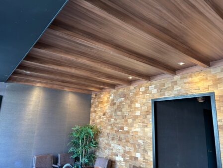 Ook voor een plafond in dit fraaie notenhouten design, draaien we onze hand niet om!